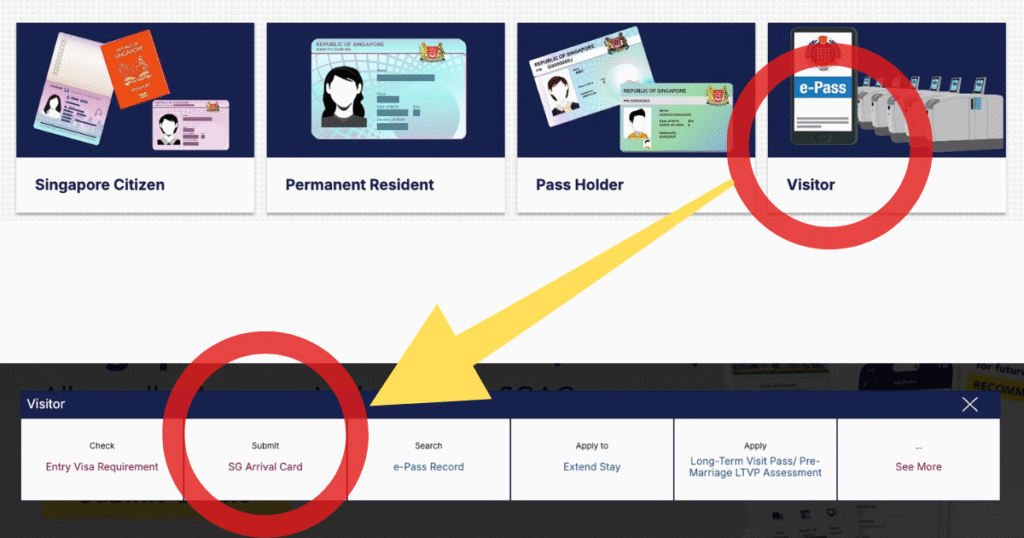 TOP画面から少し下にスクロールをすると、「Visitor」という項目があるので、ここをクリックした後、「Submit / SG Arrival Card」をクリックしましょう!